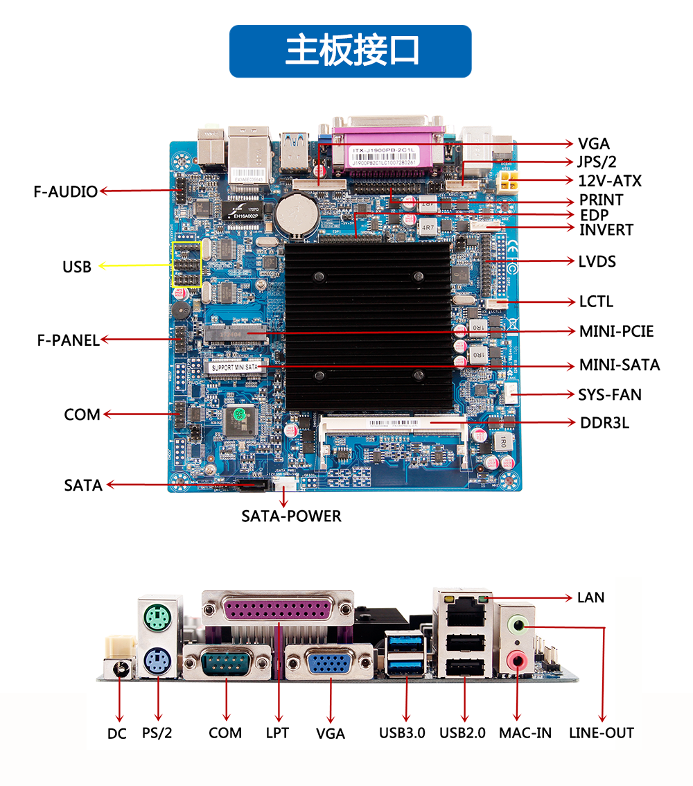 板贴Intel® Bay Trail J1900(可选J1800) 四核2.0GHz CPU,可睿频至2.42GHzVGA, LVDS、(EDP)支持同步/异步双显功能2 COM RS-232(可选4COM),9USB 2.0, 1 USB 3.0, 8-bit GPIO, WIFI, 3G, SSD板载功放,提供数字音频SPDIF支持无盘启动,网络唤醒,上电开机,定时开机板载集成Intel HD4000显示核心支持DC+4PINATX供电